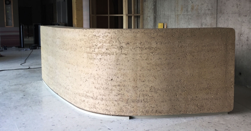 RF Studio a choisi la terre crue, et plus précisément la technique du pisé, pour la réalisation du mobilier de l’accueil d’un immeuble de bureau. Le projet nommé « Curve » a été confié à amàco.