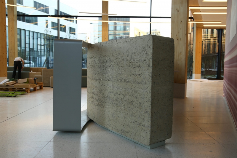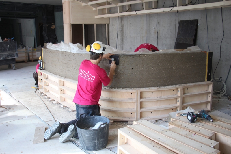 Dans ce cadre, amàco réalise deux banques d’accueil en pisé de couleur grise. Le défi de ce projet « Curve », comme son nom l’indique, est à la fois la forme courbe des banques d’accueil mais aussi la réalisation d’arrêtes arrondies. Ce pisé fin de 7cm d’épaisseur est réalisé sur site. Des caissons bois jouent le rôle de coffrage perdu et permettent d’aménager l’intérieur des banques d’accueil.