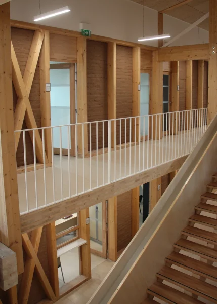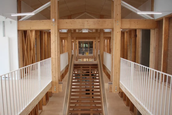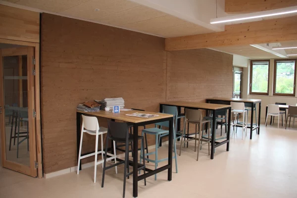 Le nouveau siège de la communauté de communes Moselle et Madon (CCMM) s’implante au cœur d’un ancien site industriel à Neuves-Maisons (54) dans la région Grand-Est. Livré début 2024, le bâtiment neuf construit à partir des ressources locales donne à voir ses éléments constructifs : la structure en bois et les cloisons intérieures en briques de terre crue. En amont de la construction du bâtiment, un chantier école participatif est proposé par la CCMM afin de réaliser les 18 000 briques de terre crue nécessaires à la construction des murs intérieurs du siège communautaire.