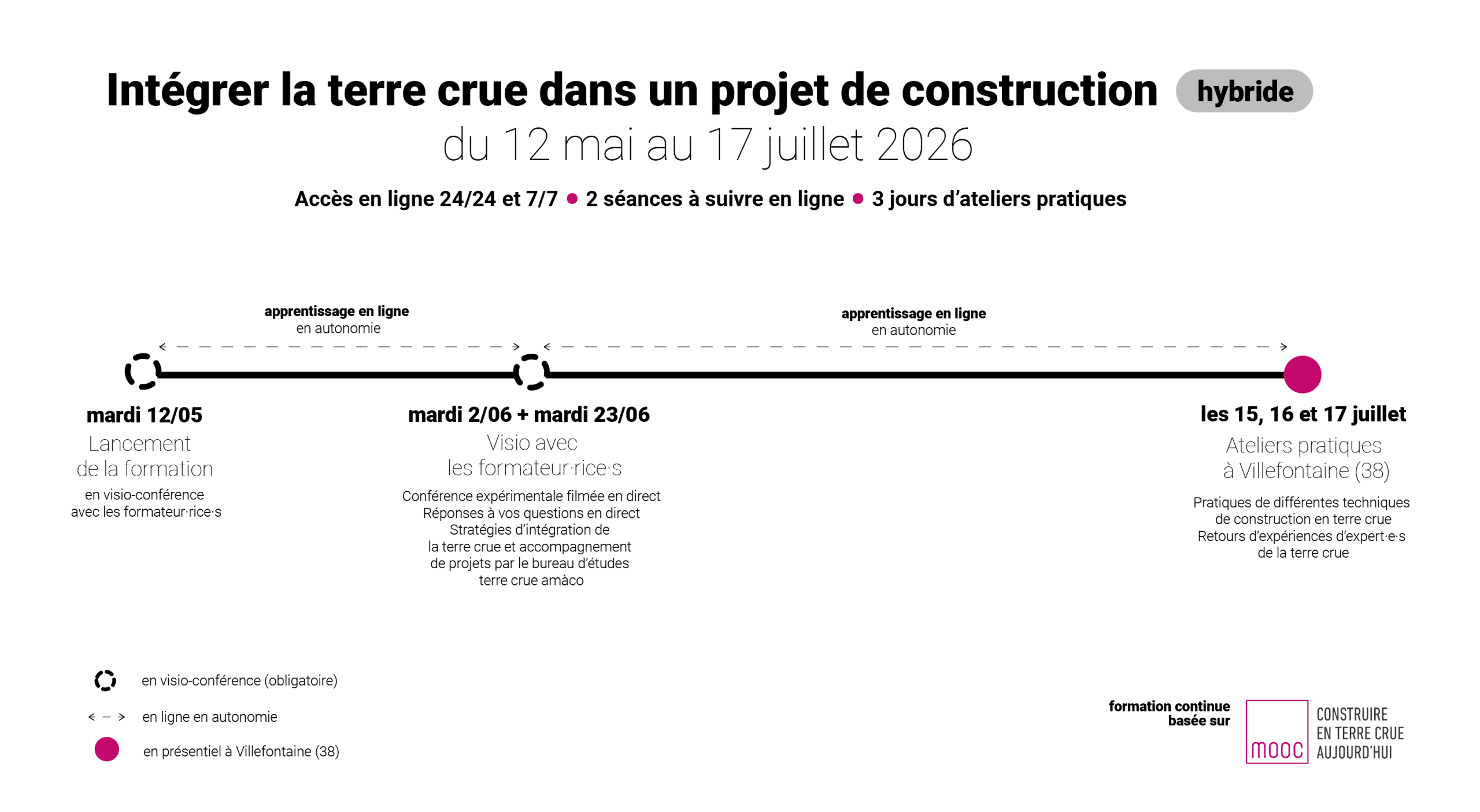 La formation Intégrer la terre crue dans un projet de construction – Argumentation, stratégie et faisabilité – Format hybride s’adresse aux professionnels de la conception et de la gestion de projets de construction ou de rénovation. Elle propose une introduction complète aux propriétés et aux potentialités de la terre crue en tant que matériau de construction. Les apprenants acquièrent les connaissances nécessaires pour identifier les différentes techniques, comprendre leurs spécificités et faire des choix d’intégration pertinents dans un projet de construction.