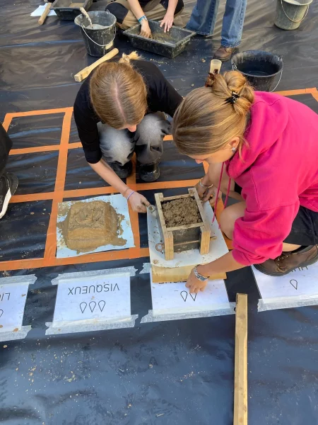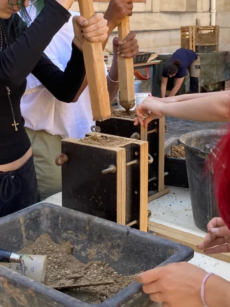 Pour commencer, amàco anime, jeudi 18 septembre 2025, un atelier d’initiation à la construction en terre crue et en fibres végétales auprès de 45 étudiant·es issu·es de 3 cursus de formation du Campus Versailles : Métiers de la construction et du patrimoine bâti, Design et Métiers du Bois, et Classe préparatoire aux métiers d’art d’excellence. Cette journée de formation est rythmée par des temps théoriques et pratiques : sciences de la matière, atelier dirigé, conférences sur les techniques de construction en terre crue, découverte des architectures vernaculaires et contemporaines en terre crue et trois ateliers pratiques pour réaliser de petits éléments en terre (pisé, adobes, terre allégée, torchis, enduit).