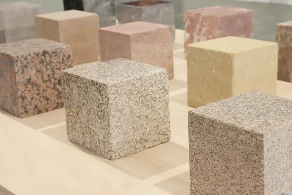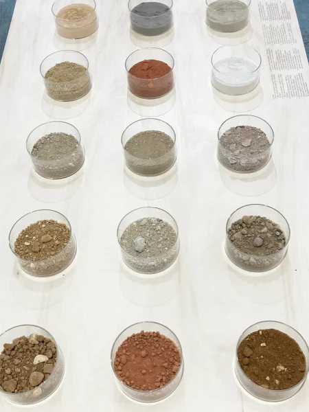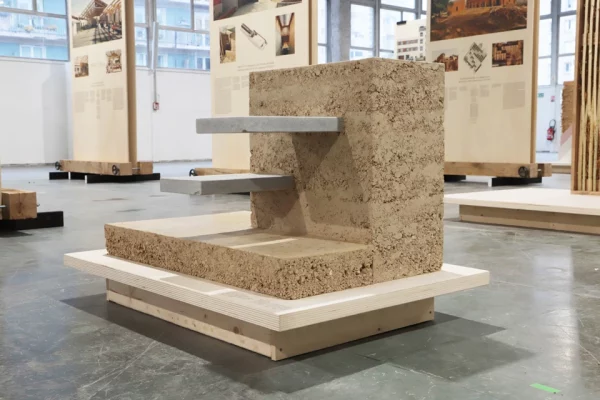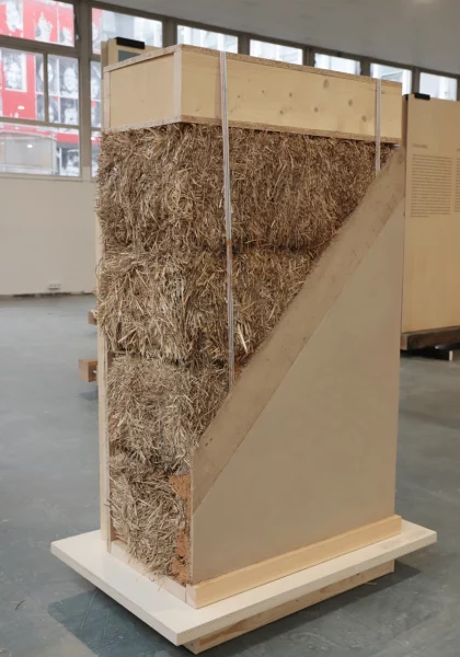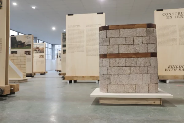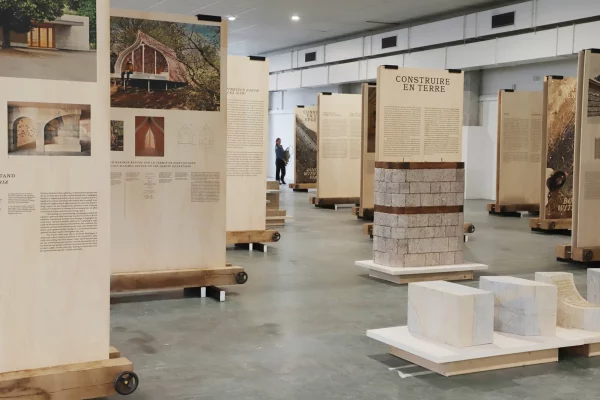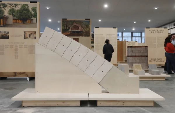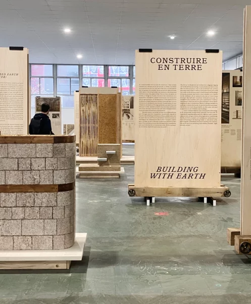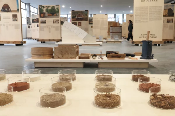 Pour accompagner la présentation des 40 bâtiments en terre, pierre, fibres végétales, et des différentes techniques de construction, 11 fragments de projet ont été réalisés par amàco, les Compagnons du Devoir et Les Grands Ateliers. Ces prototypes prennent parfois la forme d’écorchés détaillant les couches composant la paroi, illustrent des matérialités remarquables ou décomposent les étapes de transformation de la matière en matériau.