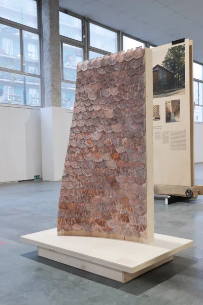 – Bardage et sol terrazzo en coquille Saint-Jacques du projet finaliste PECTEN MAXIMUS, REFUGE SUR LE CHEMIN DE SAINT-JACQUES