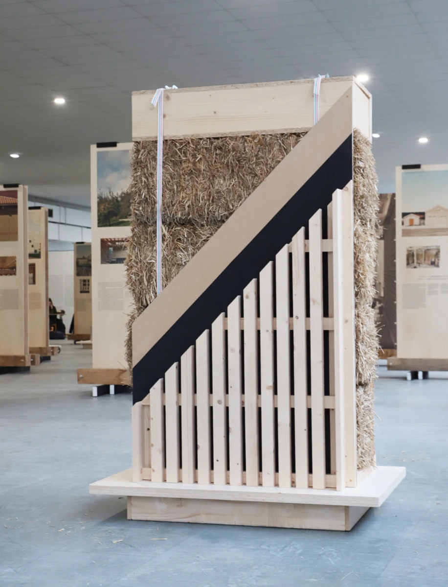 Onze fragments de murs à échelle 1 accompagnent l’exposition materia issue du prix d’architecture materia award. L’équipe design d’amàco a réalisé sept de ces éléments. Parmi eux, l’écorché du mur en paille porteuse bardé de bois sur une face et enduit en terre crue sur l’autre du projet finaliste MAISON DE VILLE EN PAILLE PORTEUSE des architectes Cédric Hamelin et Mathilde Lapierre de l’association Nebraska.