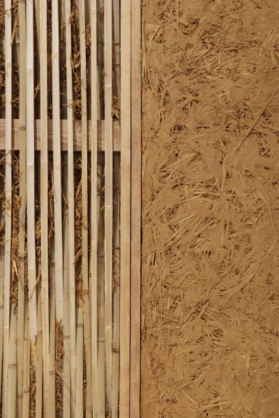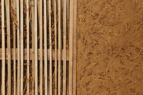 Afin de réaliser ces murs préfabriqués, les Grands Ateliers ont construit des cadres en bois dans lesquels ont ensuite été tressés des clayonnages en bambou. Le mélange de terre et de paille vient remplir l’ossature sur ses deux faces. Ensuite, l’équipe amàco a appliqué un enduit terre crue en trois passes : barbotine, enduit de corps fibré et enduit de finition fibré.