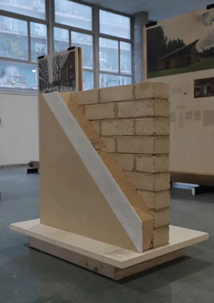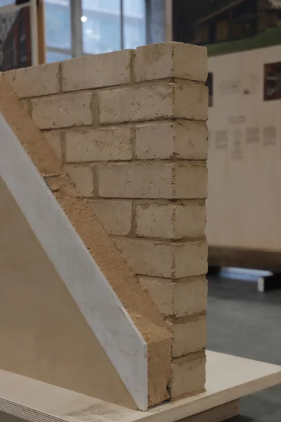 Onze fragments de murs à échelle 1 accompagnent l’exposition materia issue du prix d’architecture materia award. L’équipe design d’amàco a réalisé sept de ces éléments. Parmi eux, la paroi en blocs de terre comprimée (BTC) en remplissage d’une structure bois et isolée en fibres de bois du projet CENTRE MÉDICAL GILBERT-RABY.