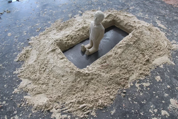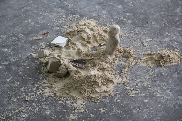 Fort·es de ces premiers apprentissages, les étudiant·es sont ensuite venu·es aux Grands Ateliers pour quatre jours consécutifs de workshop sur le sable. Changement d’échelle : nous travaillons sur des installations géantes diverses et variées. L’objectif est d’appréhender les limites physiques du sable pour pouvoir mieux les interpréter dans l’exercice final du module : « Muraille et dentelle de sable ».